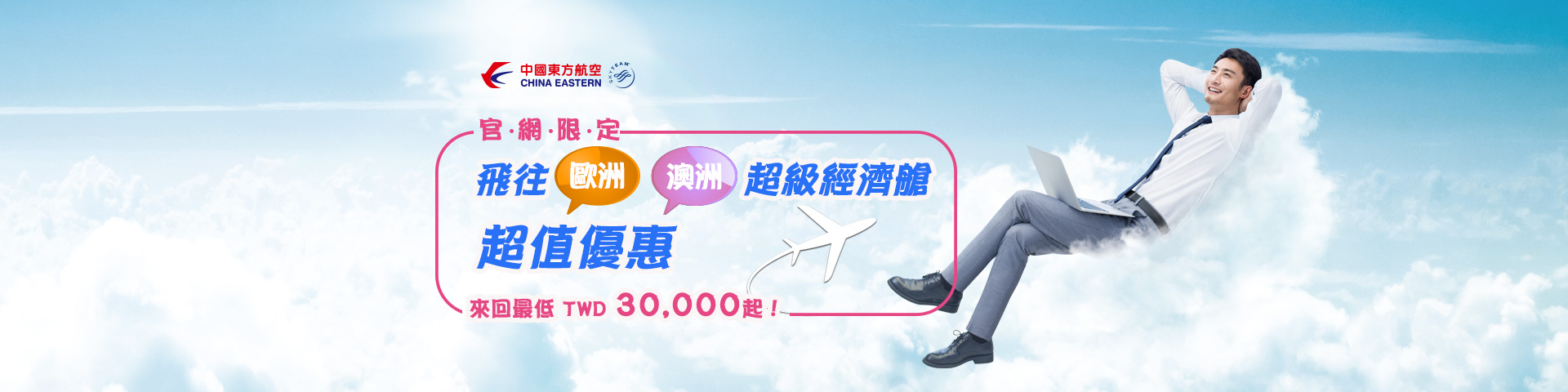 本優惠案僅適用於台灣始發經上海浦東中轉至歐洲/紐澳指定航點之超級經濟艙來回機票,且全程須為中國東方航空/上海航空實際承運正班機。